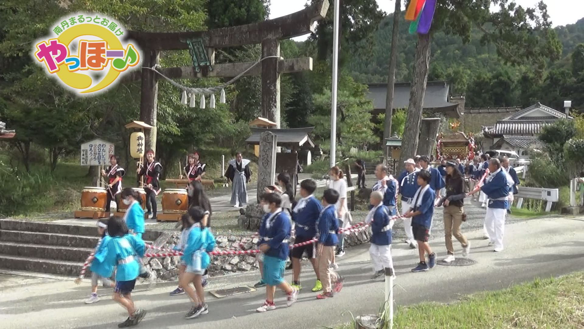 11日の午後には、地域の子ども達も集まり、摩気太鼓の奉納演奏の合図で神社を出発し、沿道では氏子らが神輿の渡御を見守りました。