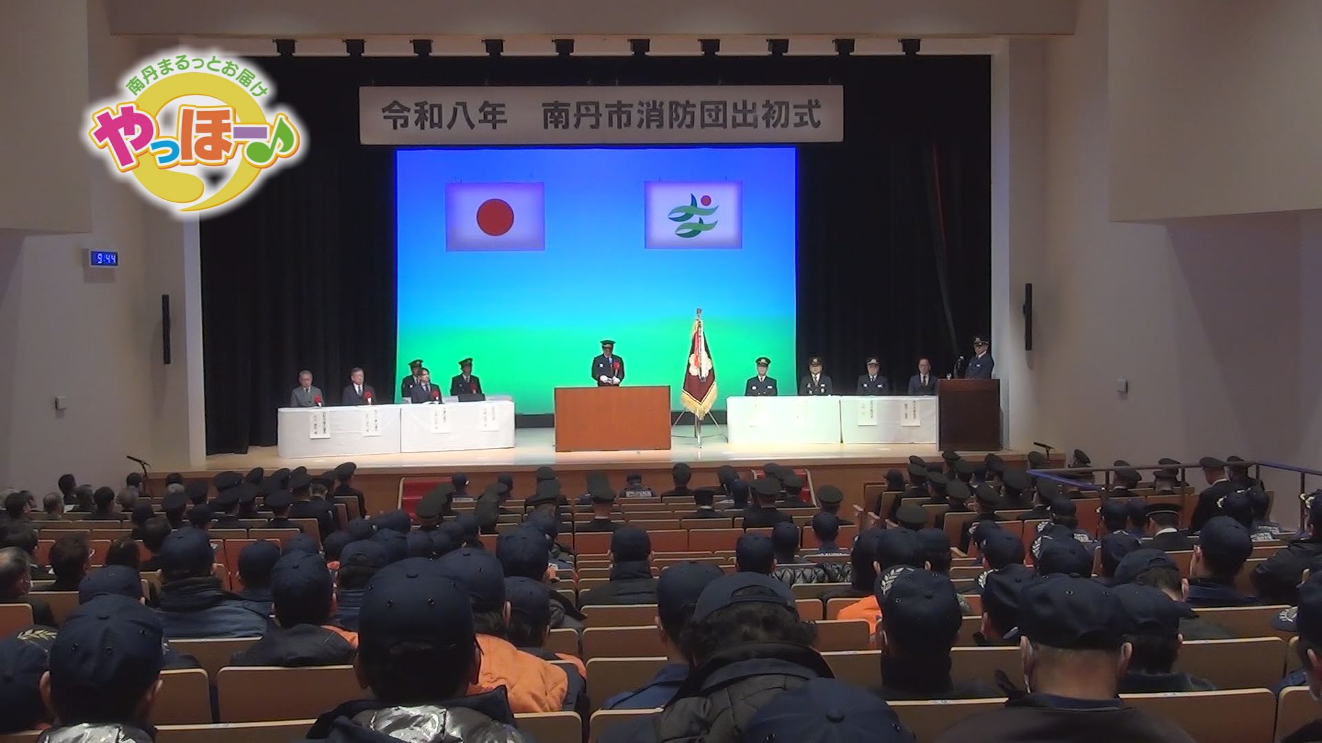 1月11日、園部文化会館アスエルそのべで、令和8年 南丹市消防団の出初式が行われ、団員らおよそ300人が出席しました。