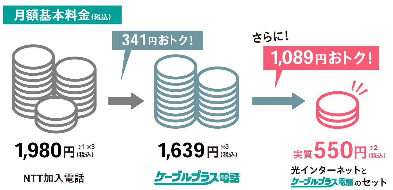 - KCNなんたんの光インターネットをご利用で、ケーブルプラス電話にセットでご加入いただく際の実質料金です。ケーブルプラス電話の月額基本料金は1,639円です。