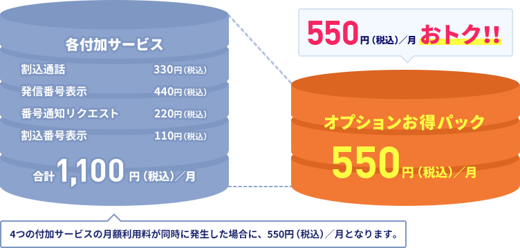- オプションお得パックは、パックに含まれるオプションサービス(オプションお得パック対象)すべての利用料が発生する月のその付加サービス利用料に自動で適用されます。